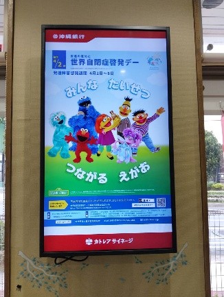 発達障害啓発週間では「クワイエットアワー」以外も様々な啓発活動がされていました。 *沖縄自閉症協会 まいわ~るどさんからのご依頼もあり、沖縄県内の幅広い業種の皆さまの協力を得られました。今回は写真に収められました範囲にて掲載しております。 |