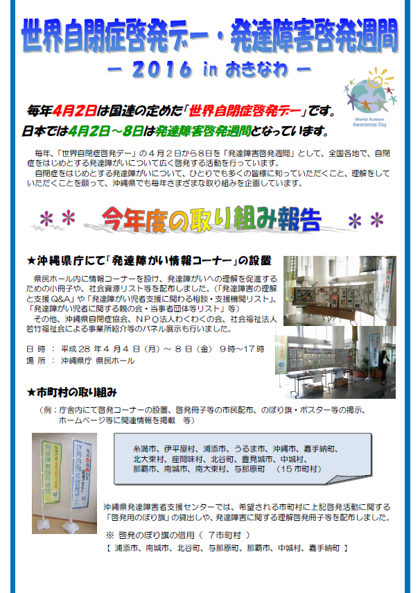 世界自閉症啓発デー・発達障がい啓発週間2016inおきなわ 開催のご報告